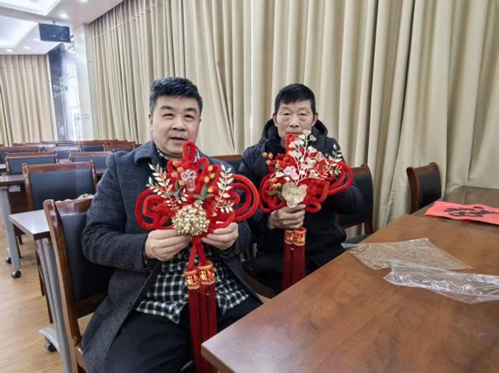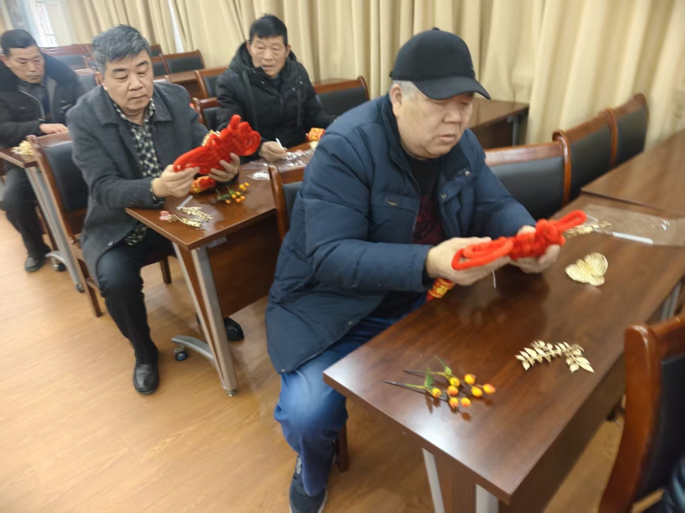 活动伊始,退役军人在工作人员的贴心指导下,手持备好的中国结与新春装饰,根据个人喜好精心搭配、巧手插制,大家边动手边轻松交流,指尖翻飞间,一个个缀满新春装饰的中国结接连成型,现场红韵满堂,年味浓郁,尽显喜庆祥和的美好氛围。