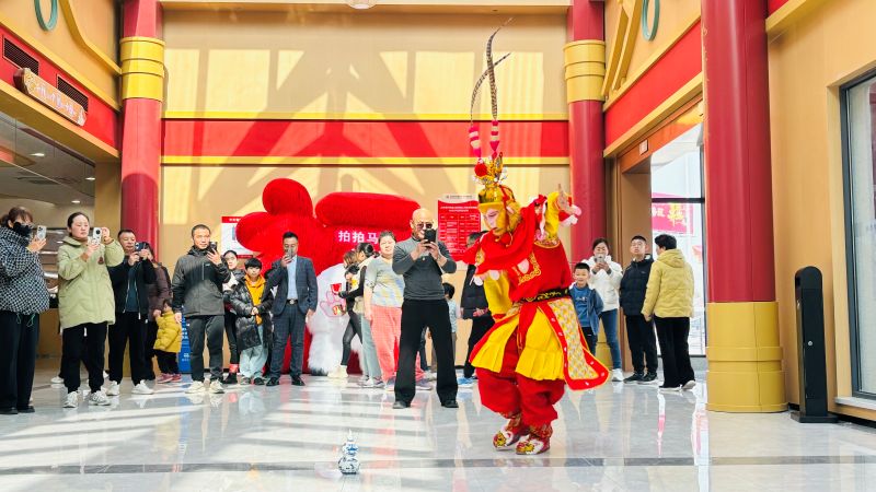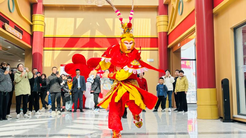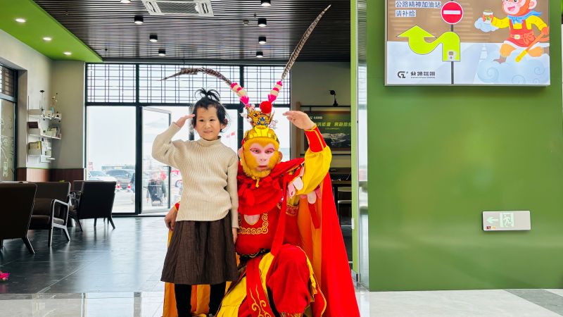 春运期间,服务区特邀淮安市非遗猴戏传承人驻场演出。每日两场,安排在客流高峰时段。传承人身披铠甲、手持金箍棒,一个筋斗、一个眨眼,便把孙悟空的灵动桀骜演活了。现场互动环节更是气氛高潮,孩子们争着上台学耍金箍棒,大人则举着手机全程跟拍。这段“非遗猴戏遇上西游服务区”的短视频,短时间在抖音收获数万点赞,评论区满屏都是“求定位”“下次路过一定要去”。