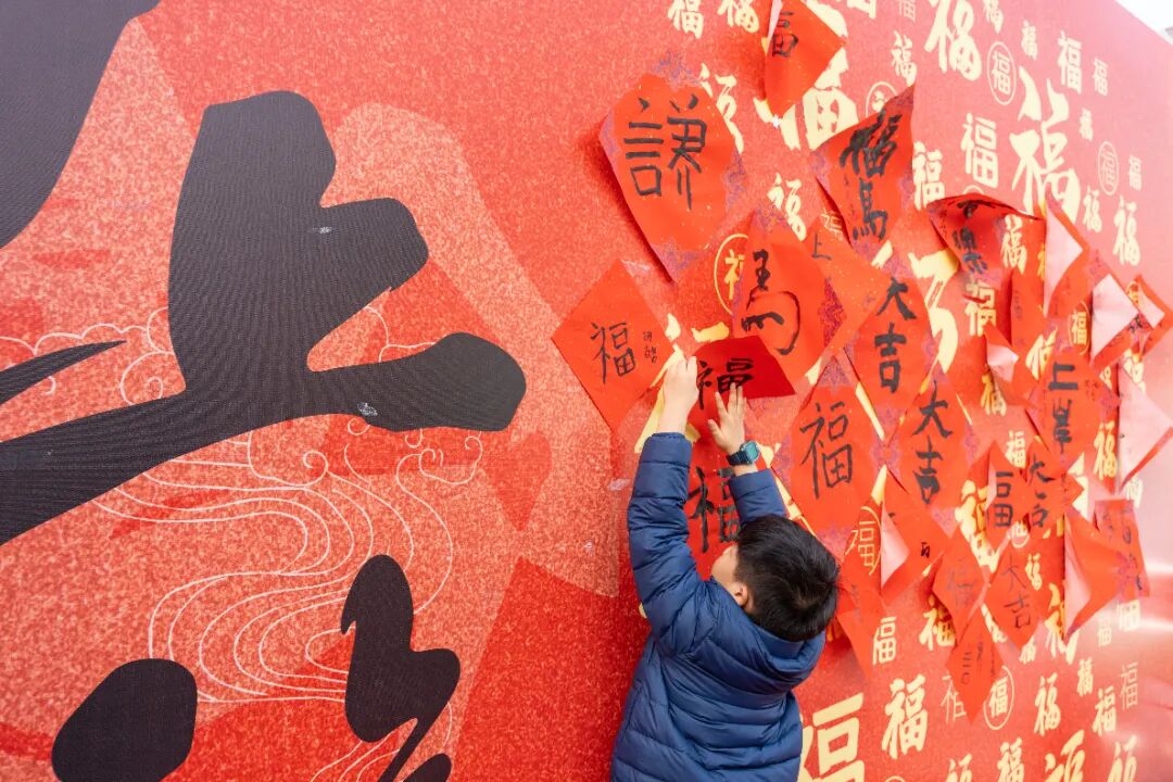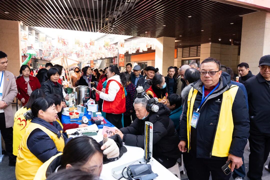 在“赠福迎新”区,书法家们将一幅幅载满吉祥的祝福赠予市民,并指导大家在公共书写台前亲手落墨写“福”。完成的作品汇集于“百福墙”集中展示,寓意万家福泽于此交融汇聚。不少市民在此拍照打卡,定格“百福环绕”的新春记忆。“养生品鉴”区内暖意氤氲,现场慢熬的红糖姜枣茶与清润炖梨汤香气袅袅,供市民驻足暖身、细品温情。一旁还设有采耳、按摩、义诊等便民服务项目,由本地志愿者组织与专业社工机构共同提供。
