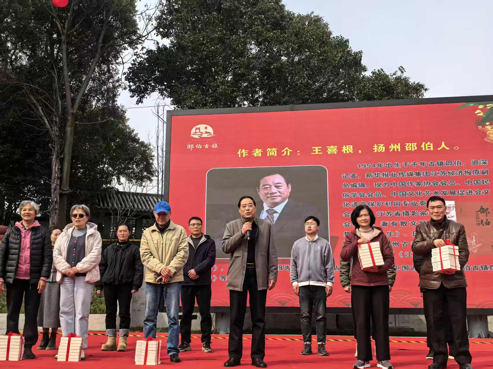新华日报·交汇点讯(记者华诚)3月20日,农历二月二龙抬头,大运河畔的扬州邵伯古镇春意正浓。作家王喜根步履矫健,与昔日同窗好友一同回到这片生养他们的故土。此行,他们受邀参加由江都区文体旅局、邵伯镇政府和江都文联联合举办的邵伯龙虾美食街开市仪式,更重要的是,王喜根要将自己的最新力作《邵伯古镇风情》,亲手捐赠给家乡。