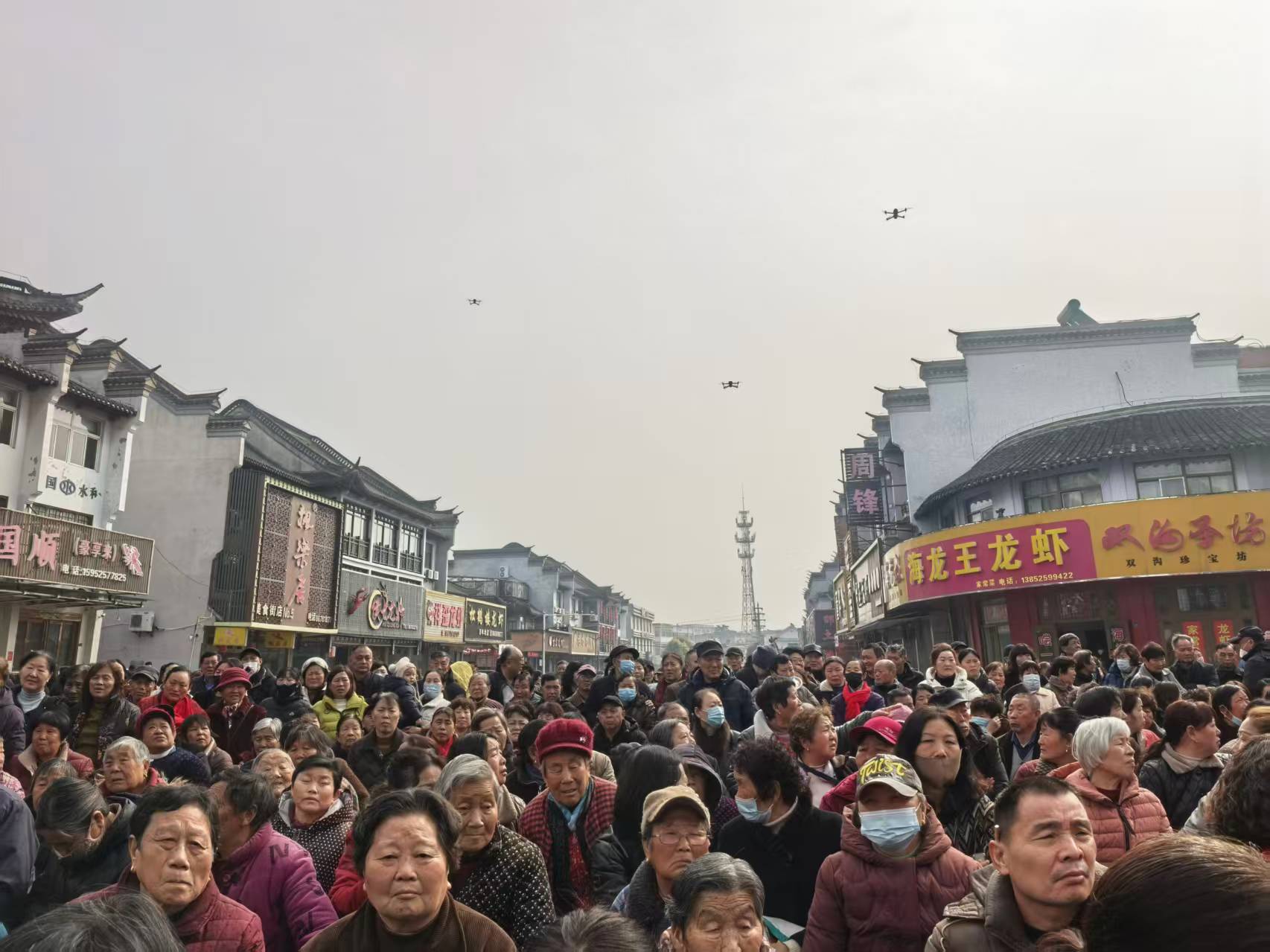 当天的邵伯古镇,街头巷尾一派热闹景象。红灯笼挂满枝头,舞龙队伍上下翻腾。老街坊们聚在一起,抱着孩童,牵着宠物,共赴这场满是乡土味、文化味的春日盛会。