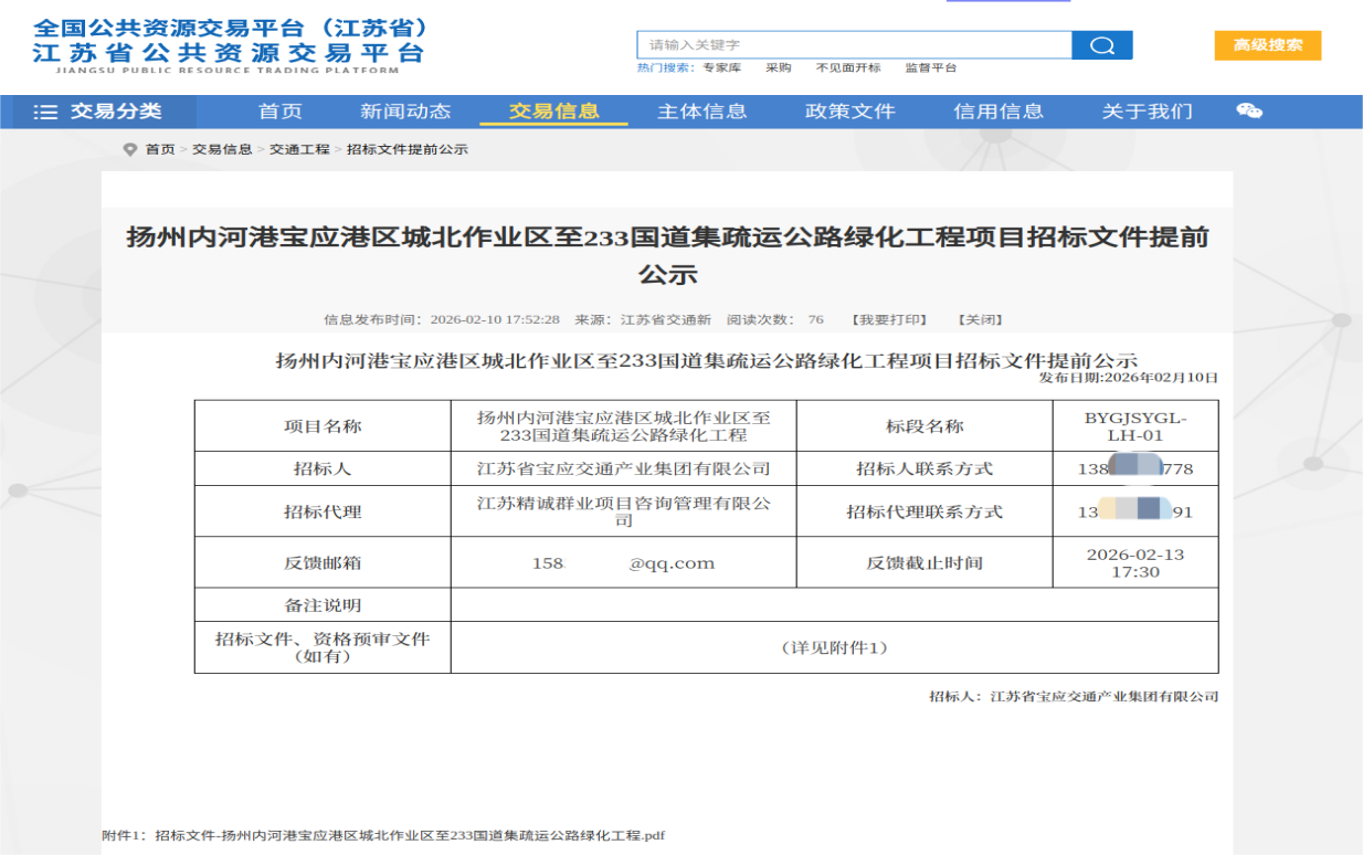 近日,宝应县交通工程建设管理创新取得重要进展——“扬州内河港宝应港区城北作业区至233国道集疏运公路绿化工程”招标文件在江苏省公共资源交易平台提前公示,标志着该县交通项目招标文件提前发布实现“零的突破”。这是宝应县深入贯彻优化营商环境部署、推动交通建设管理公开透明的具体实践,也是提升招投标公信力、服务高质量发展的重要举措。