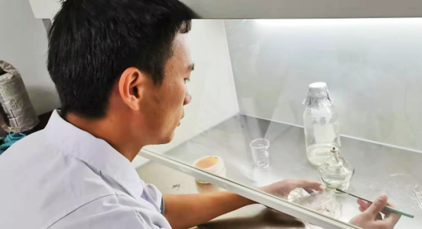 清晨的薄雾尚未散尽,小麦研究室的刘立伟和刘静已经踏着晨露俯身麦垄,他们手持记录本与标尺,指尖抚过鲜嫩的麦叶,目光专注地打量着每一株麦苗。从分蘖数量、株高姿态,到叶色光泽、抗病表现,逐行排查、逐株观测,每一个细微性状都认真比对、精准记录,不放过任何一个优良变异的蛛丝马迹。实验室里,科研人员朱雪成身着白大褂,在无菌操作台前端专注操作,小心翼翼地培养禾谷镰刀菌。这些用于赤霉病接种的菌种,是攻克小麦“癌症”的关键突破口。