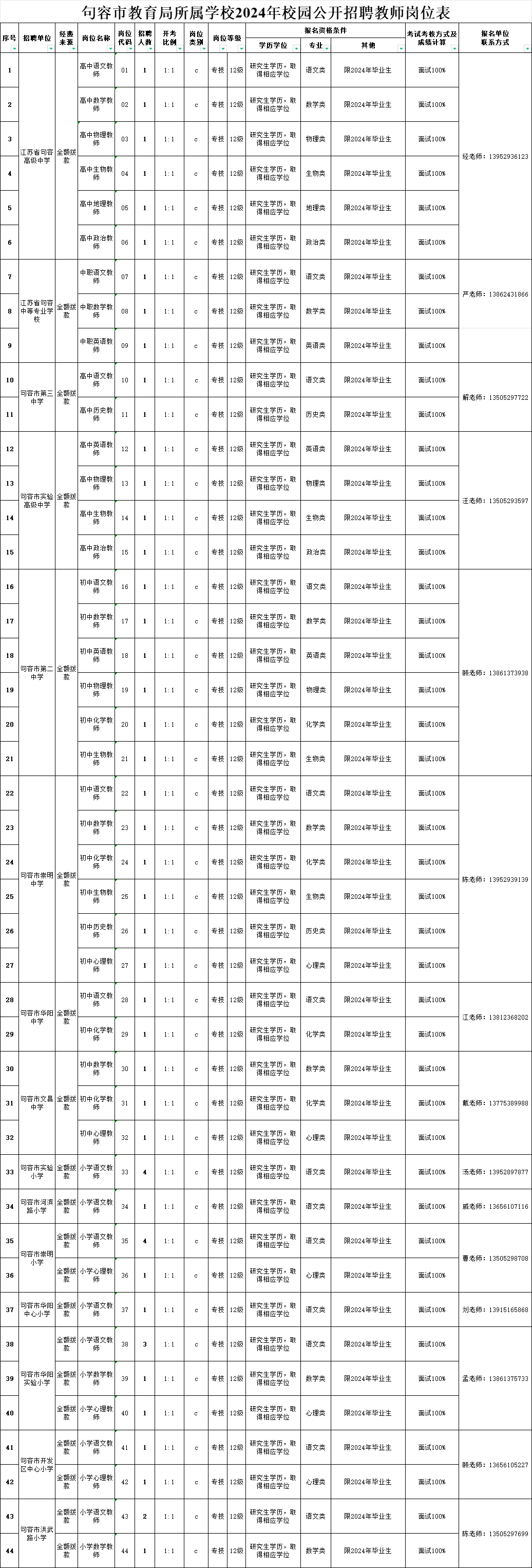 句容市教育局所属学校2024年校园公开招聘教师岗位表