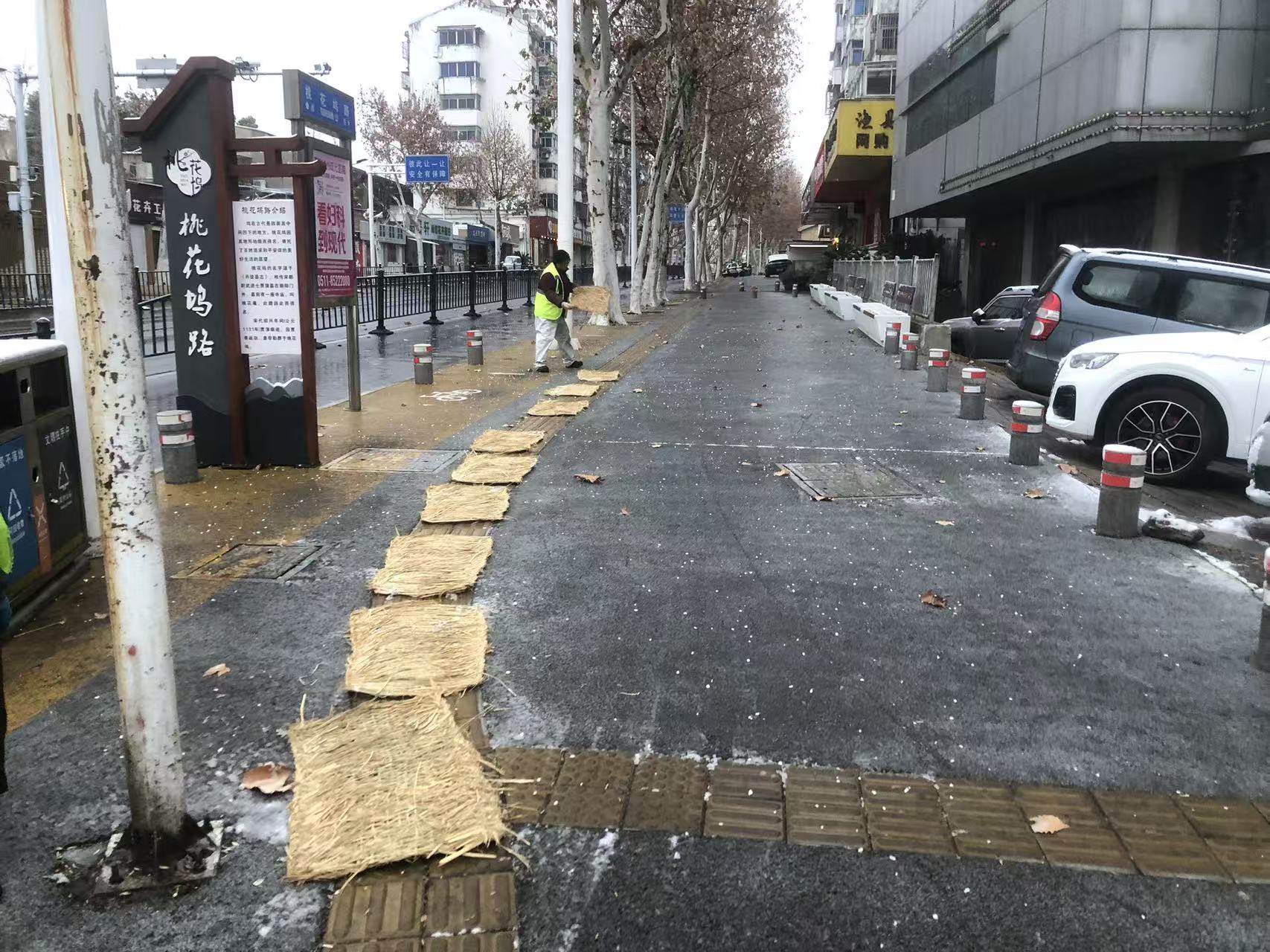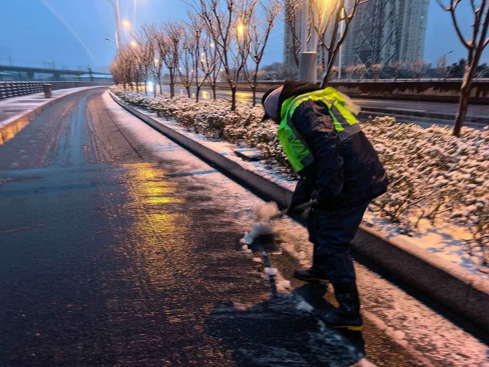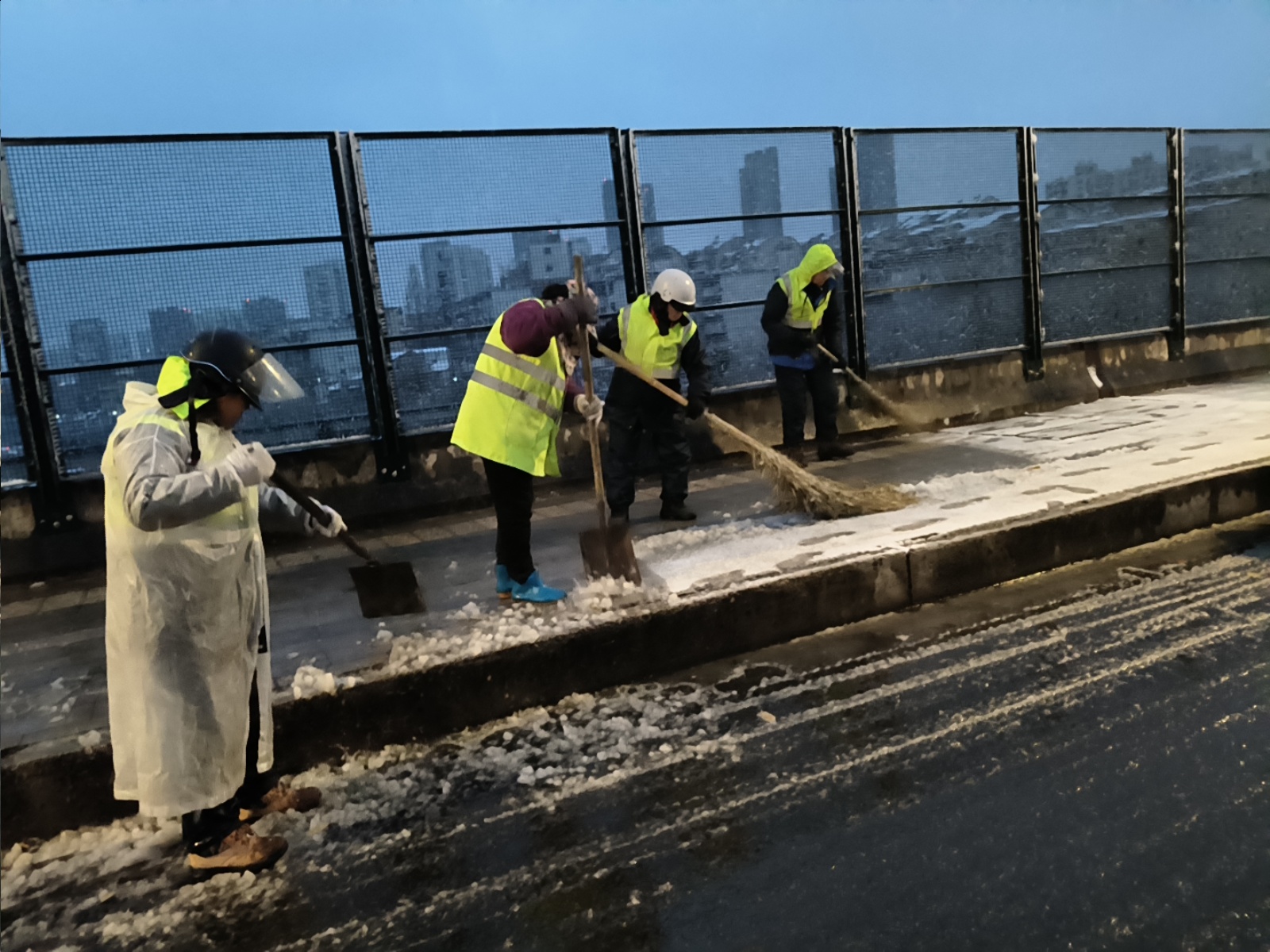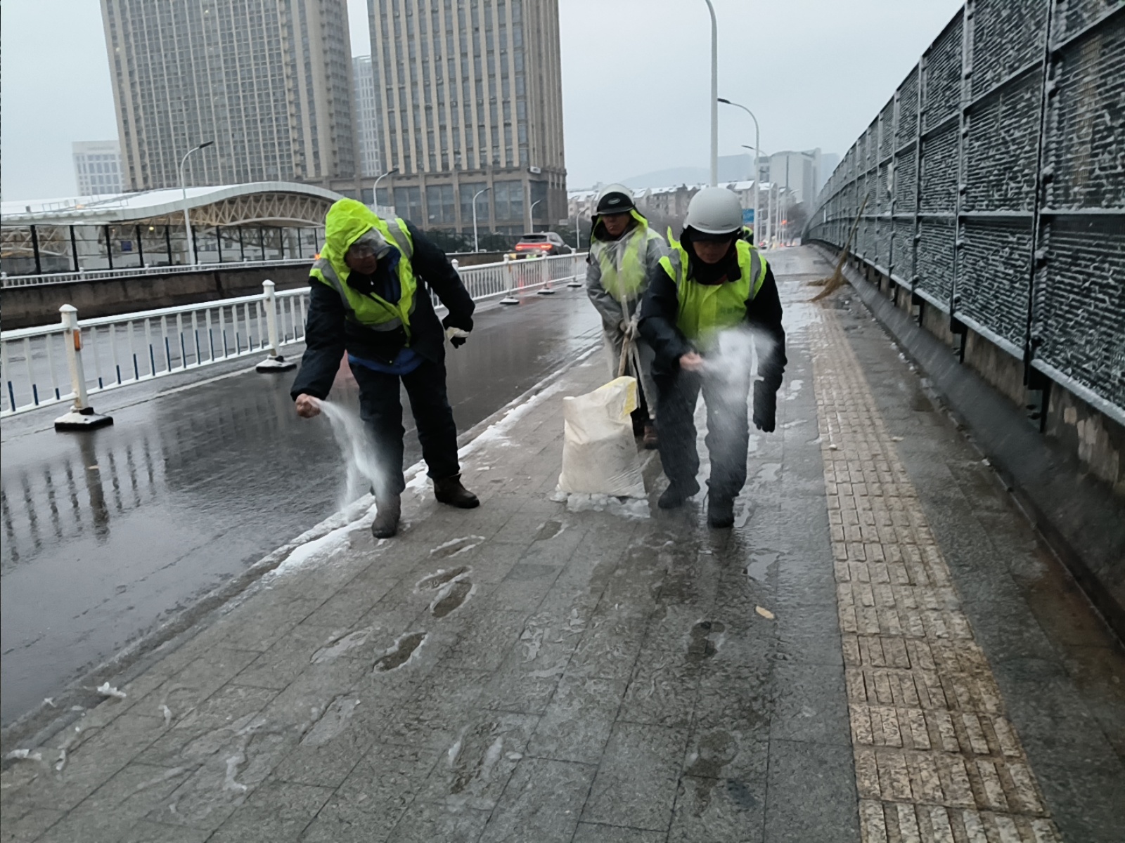 与此同时,市环卫中心业务考核班组加强全域巡查,重点盯防桥梁、陡坡、弯道及事故易发路段。针对巡查中发现的九华山路高架桥、解放桥等部分路面结冰情况,应急人员迅速处置,通过抛撒融雪剂、人工破冰、铺设防滑草垫等方式,及时消除安全隐患。