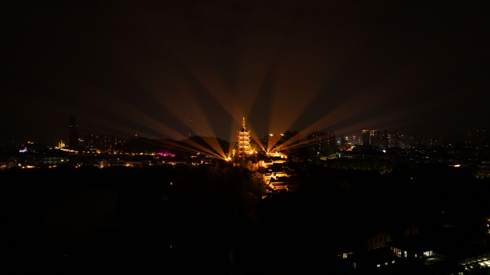 这种“光影叙事”的理念,在金山慈寿塔的亮化提升中再次展现。作为镇江“山-水-城”景观轴线的核心地标,慈寿塔承载着千年佛教文化与长江故事。2025年,镇江广景中心在原有静态照明基础上引入激光技术,将塔身笼罩于扇形摆动的金黄色激光光束中,动态激光与静态照明相得益彰,为古塔披上了流动的“金纱”。为避免光污染,激光仅在重大节日和活动期间开启,让传统与现代在克制中实现完美平衡。