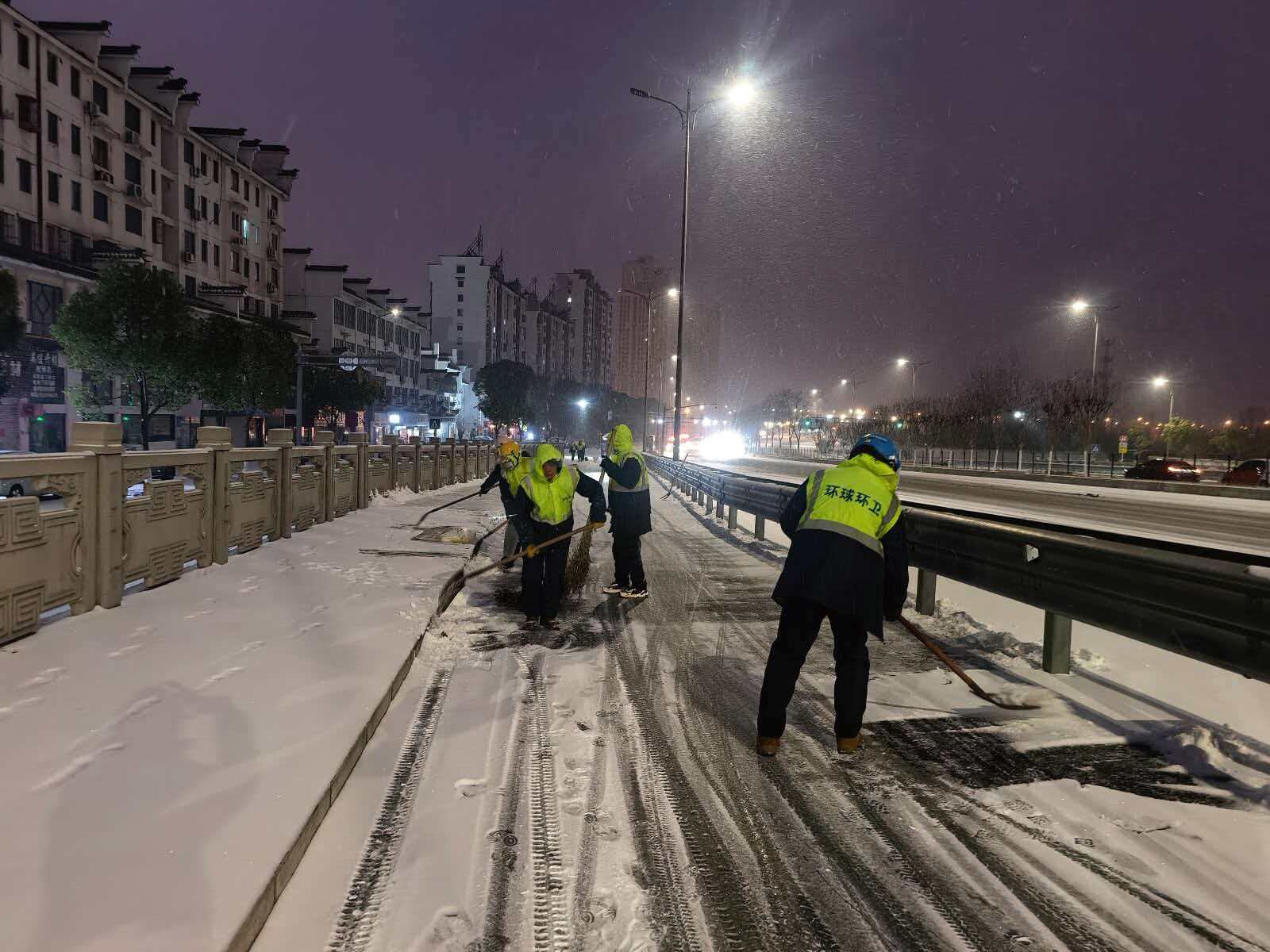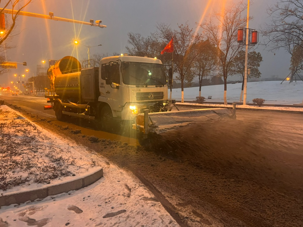 雪情就是命令。根据除雪防冻工作部署会要求,镇江市环境卫生管理服务中心(以下简称“市环卫中心”)于19日下午完成除雪车辆和人员集结。19日20时多,天空开始飘起零星小雪,市环卫中心迅速启动除雪防冻应急预案,针对高架、桥梁、涵洞等地段易结冰的特点,21时撒布机开始提前行动,对九华山路高架桥、解放路高架桥、七里甸铁路桥、北府路高架桥等59处桥梁、道路抛洒融雪剂,防范路面出现积雪结冰隐患,为后续除雪作业奠定坚实基础。同时市环卫中心强化24小时值班值守机制,密切监测天气变化,人员车辆随时待命准备应对雨雪天气。
