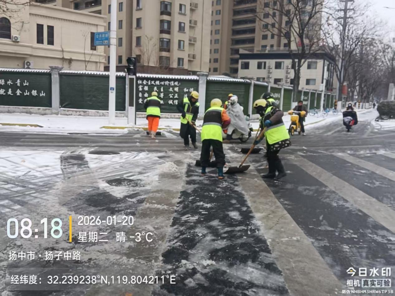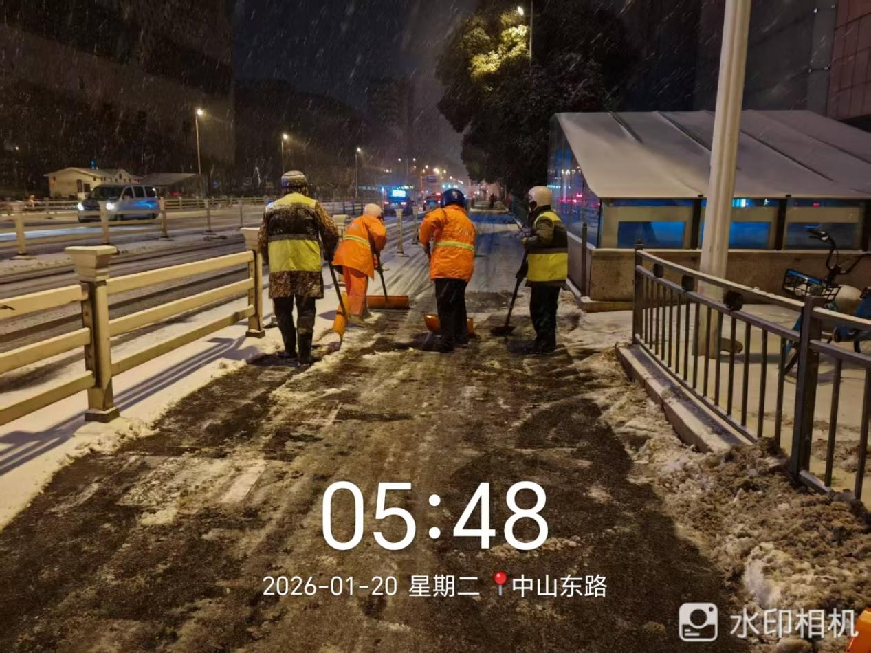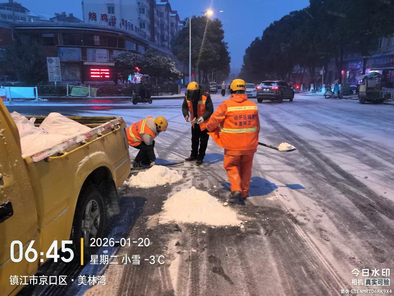 镇江经开区综合行政执法局迅速启动应急预案,统筹调度各环卫作业单位,科学有序开展除雪保畅工作。20日清晨4时许,作业人员提前到岗,优先对辖区桥梁、陡坡、背街小巷及公交站台、学校、医院周边等重点区域撒布融雪剂。各类除雪机械开足马力、梯次推进,环卫工人同步开展人工清扫;中午借助气温上升有利条件,执法局调配高压冲洗车、洗扫车等设备,对主次干道残留雪冰进行彻底清理,并延伸至慢车道、背街小巷查漏补缺,实现“清雪务尽、路见本色”,全力保障市民出行安全顺畅。