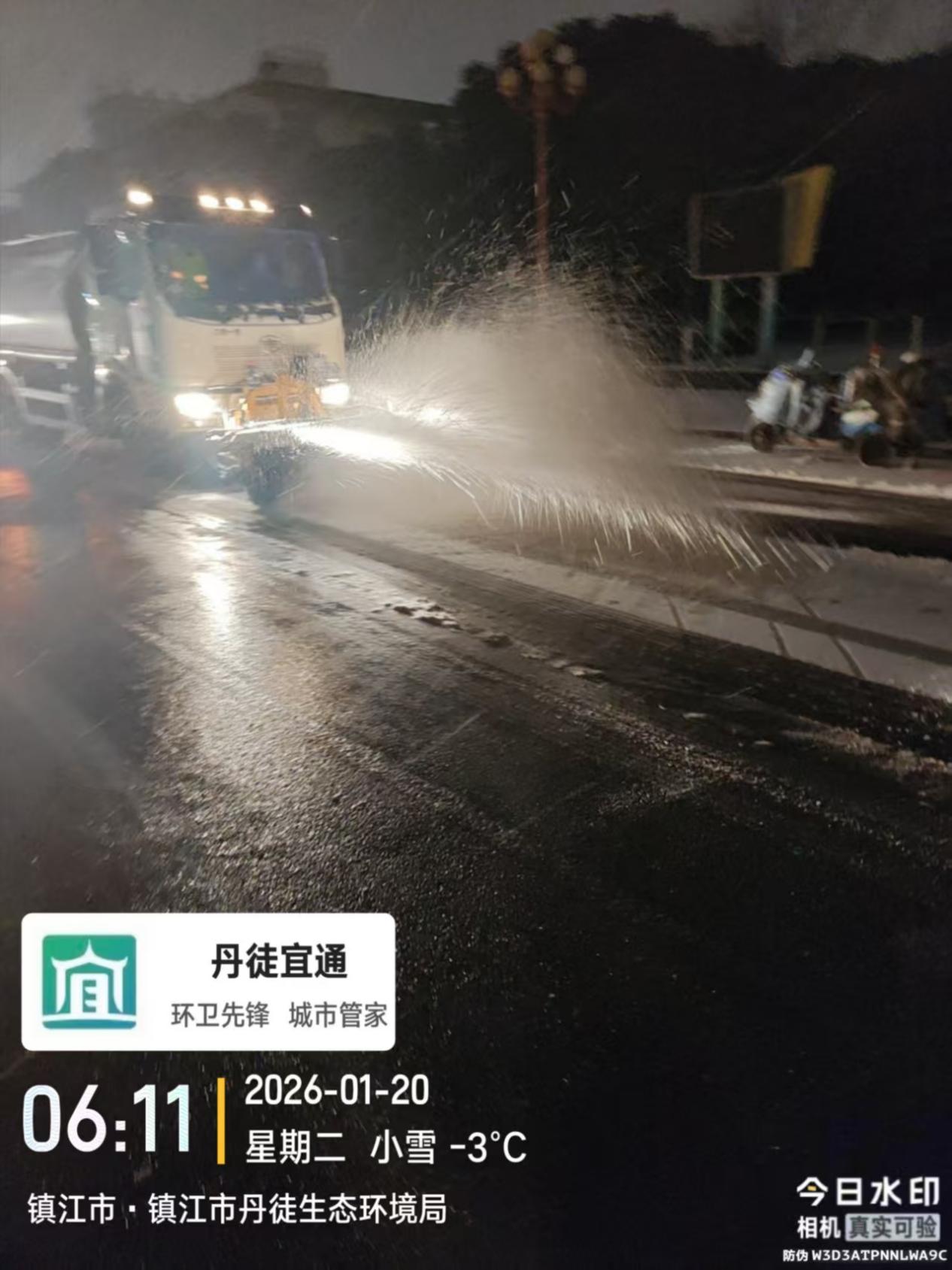 1月19日晚8时多,镇江全市自北向南陆续飘起零星小雪花;1月20日凌晨4时后,市区及各地降雪逐渐变大,最大积雪深度达3厘米,同时因气温骤降至零下,很多路段出现对交通有影响的道路结冰现象。为积极应对冰雪天气带来的不利影响,全市城管环卫系统闻令而动、向雪而行,立即启动除雪防冻应急预案,集合除雪机械化作业车辆和环卫作业人员迅速投入到除雪防冻之中,尽最大努力确保全市道路畅通和市民出行安全。