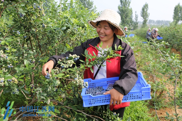 2018年6月11日,连云港市赣榆区黑林镇,果农在沃田蓝莓庄园内采摘蓝莓。近年来,赣榆区推广“工厂化栽培、基地化种植、公司化运营”模式,发展蓝莓、猕猴桃、大樱桃等特色水果产业园近20万亩,助农增收。 邵世新 王昌永 摄 视觉江苏网供图 http://v.vijs.net/cover.jsp?cid=309543