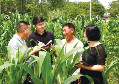 7月31日,仪征市马集镇恒华村村民赵有江承包的玉米地里,市、镇纪委工作人员正在向他了解水稻种植直补资金到账情况。