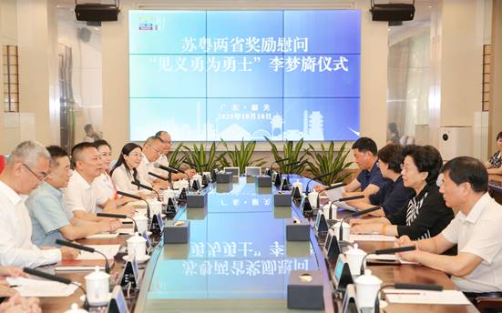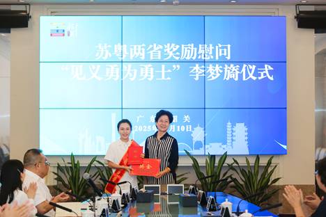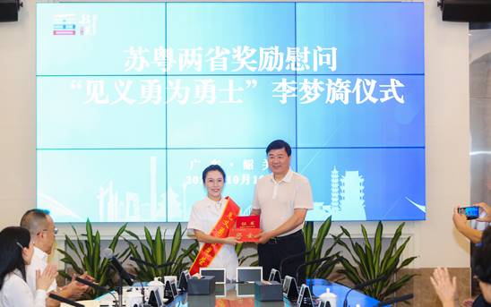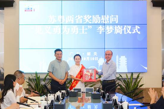 10月10日,江苏省见义勇为基金会理事长弘强、南京市见义勇为基金会理事长孙建友和广东省见义勇为基金会理事长李京,在广东韶关看望慰问2025年第二、三季度“全国见义勇为勇士”和第三季度“江苏见义勇为勇士”李梦旖同志,分别向她颁发证书、慰问金和纪念品。广东省韶关市委常委、政法委书记李泽航,广东省韶关市副市长、公安局长张岩参加慰问活动。