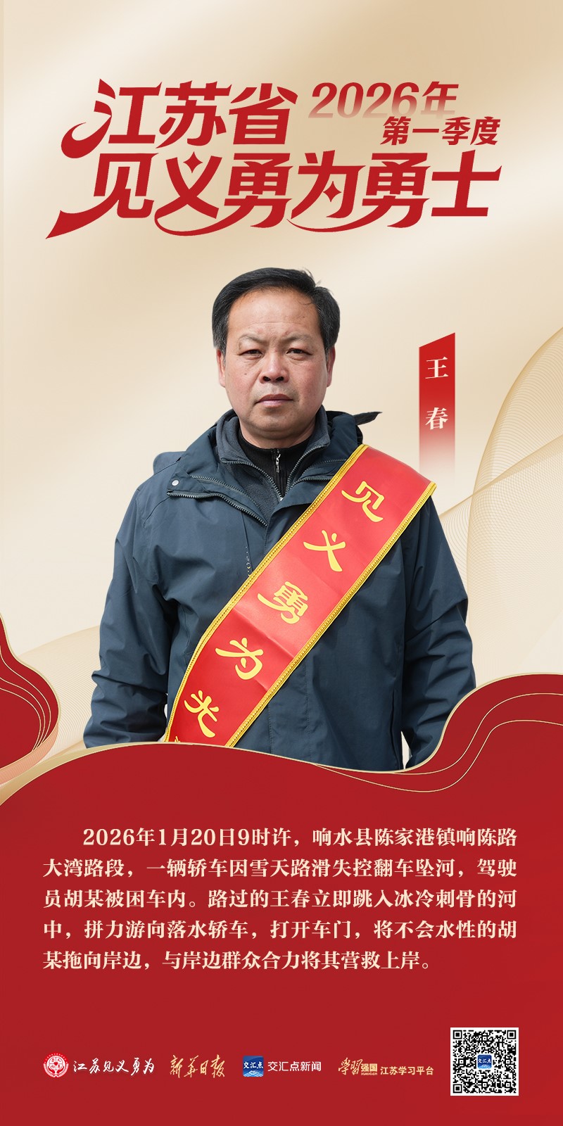 2026年1月20日9时许,室外气温低至-10℃,江苏省盐城市响水县响陈线陈家港镇路段突发惊险一幕:一辆轿车因雪后路面湿滑,失控冲入河中,司机被困车内。危急时刻,58岁的王春,不顾严寒跳入刺骨河水施救,成功将被困驾驶员救出,用行动诠释“平凡英雄”的担当。事情发生后,响水县公安局第一时间组织警力多方走访、固定证据、完善材料,将其确认为见义勇为人员。