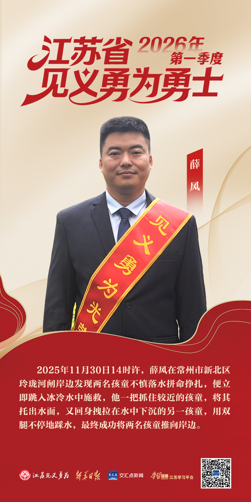 初冬凛冽,河水刺骨,一场生死救援在常州玲珑河畔惊心动魄上演。面对两名落水儿童的生命呼救,薛风纵身跃入深不见底的冰河,用血肉之躯托起两条幼小生命,谱写了一曲震撼人心的见义勇为壮歌。他的无畏壮举,让平凡身躯闪耀英雄光芒,让崇德向善的正气充盈龙城大地。