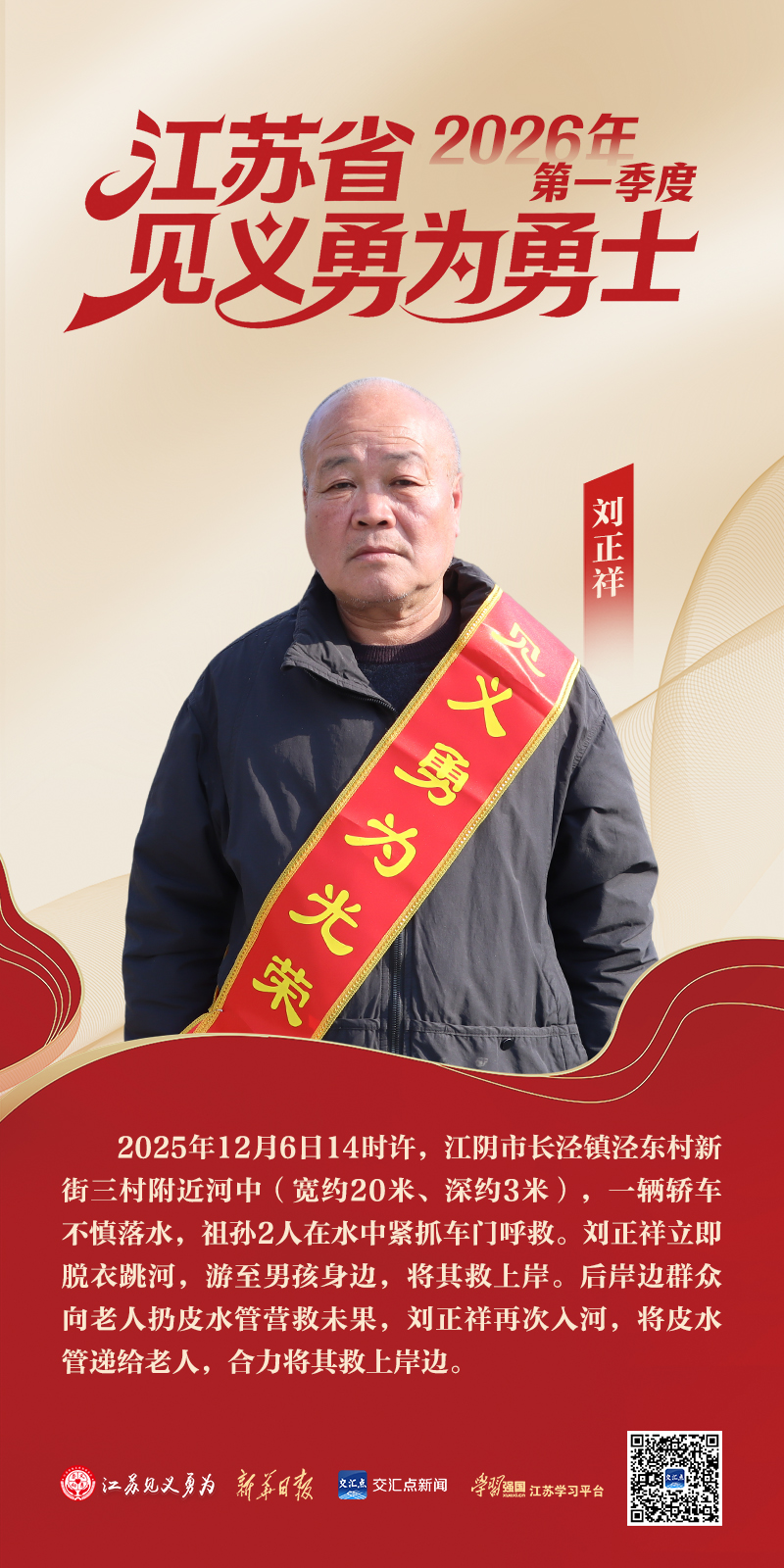 冰水中的两次纵身,是生命的托举,更是精神的传承。刘正祥用行动证明,英雄从不是遥不可及的超人,而是关键时刻挺身而出的普通人。他的善举,如冬日暖阳,温暖着江阴的大街小巷,更滋养着社会向善向美的精神土壤。受到见义勇为褒奖后,他更加积极投身于见义勇为社会宣传,参与镇里、工会、学校组织的大大小小志愿活动,带动辖区群众崇德向善!