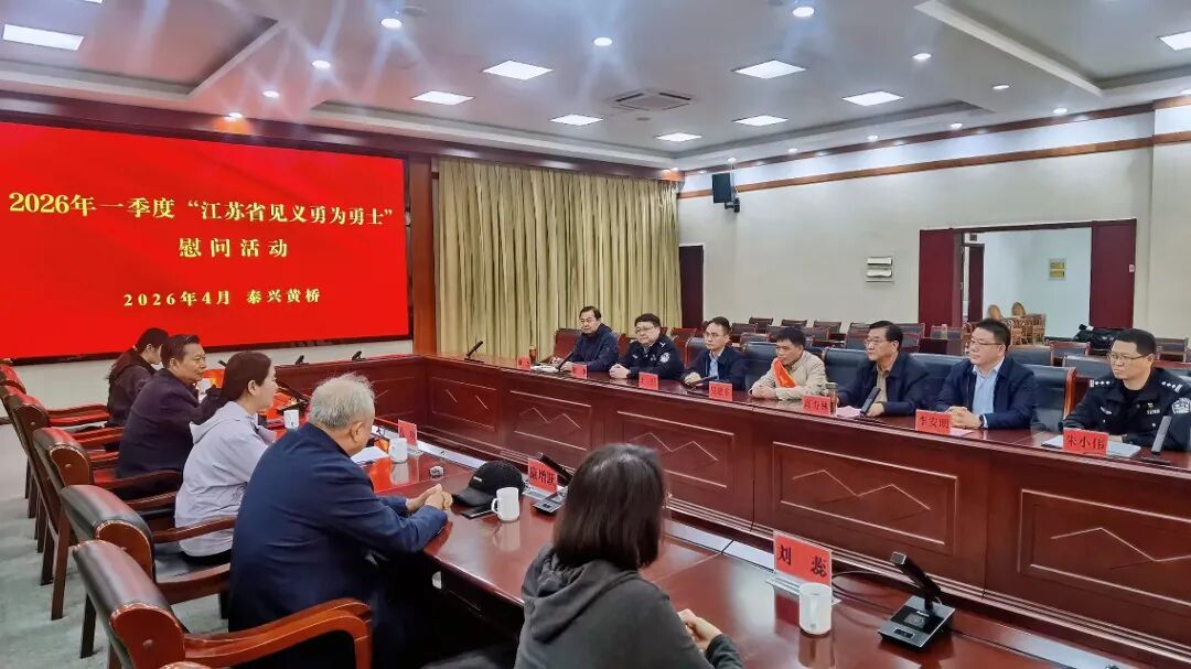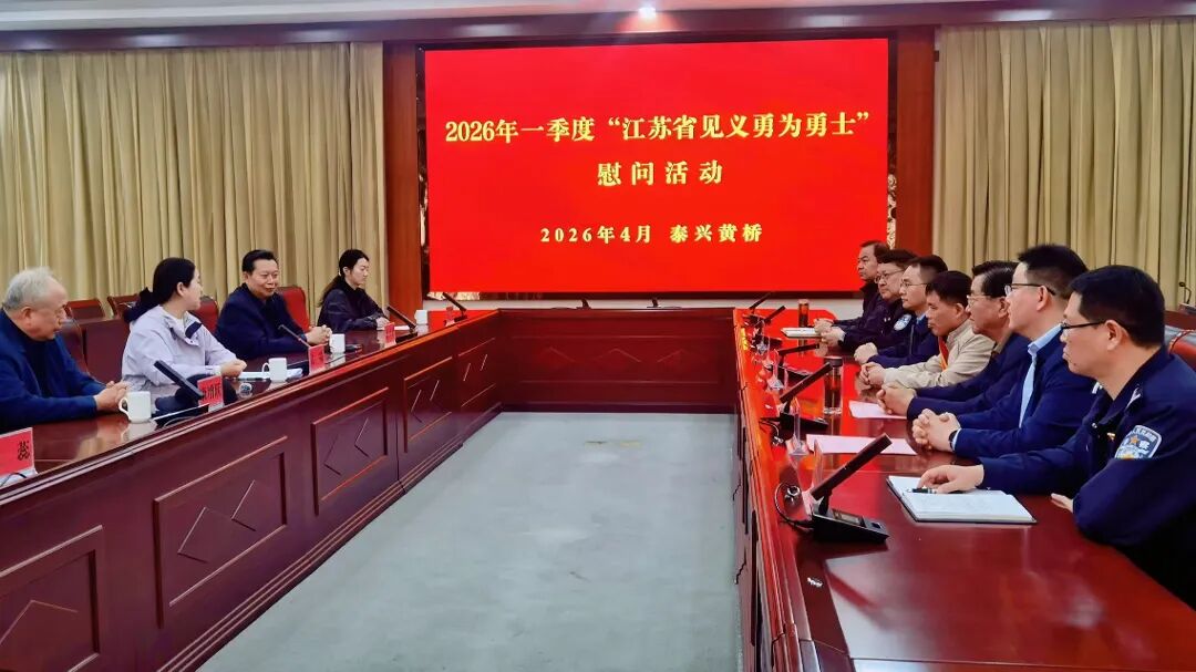 4月8日上午,江苏省见义勇为基金会理事、见义勇为工作办公室主任孔晓一行赴泰兴市黄桥镇,为2026年第一季度“江苏省见义勇为勇士”吴建东送奖上门。泰州市见义勇为基金会常务副理事长许书平、副理事长康增跃陪同参加活动,共同为这位身边的英雄送上荣誉与关怀。
