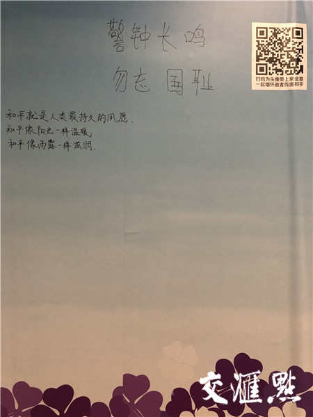 记者了解到,从2016年至今,南京大屠杀死难者国家公祭日“和平许愿墙”群众签名悼念活动已经连续举办五年,包括南京大屠杀幸存者、抗战老兵、大中小学生、国际友人、外地游客和南京各界市民在内的数万名群众在“和平许愿墙”签上自己的姓名,写下对和平的祈愿。2016年、2017年“和平许愿墙”实物被侵华日军南京大屠杀遇难同胞纪念馆收藏。