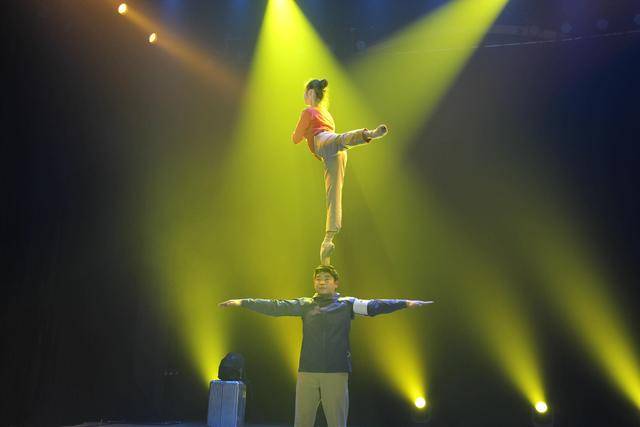 如今的杂技早已改变过去“纯炫技”的演出模式,融合舞蹈、戏剧等艺术形式,使杂技艺术更加惊、险、奇、特,且富于时尚的韵律之美。以往演员用脚尖站在同伴肩上的时候,需要打开双臂,以获得平衡。但这次,刘亮希望演员能借助舞蹈性的肢体动作推进,提出让演员在空中不打开双臂。难度更高了,但演员们经过排练,出色完成了任务。