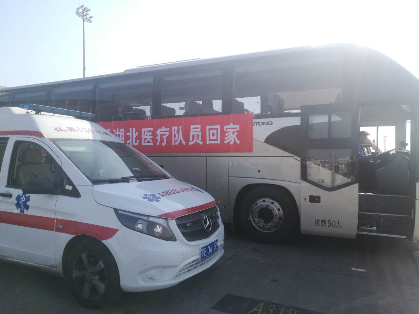 记者在禄口机场停机坪上看到,我省各市前来接医生的车队已经整齐排列。来自泰州第四医院的江灿华院长告诉记者,他们今天接回15名泰州队员,晚上6点左右在泰州高速公路一个服务区给队员们举办一个简短的欢迎仪式,然后大家在服务区用晚餐,再连晚赶到兴化的一处隔离点,开始14天的隔离休整。