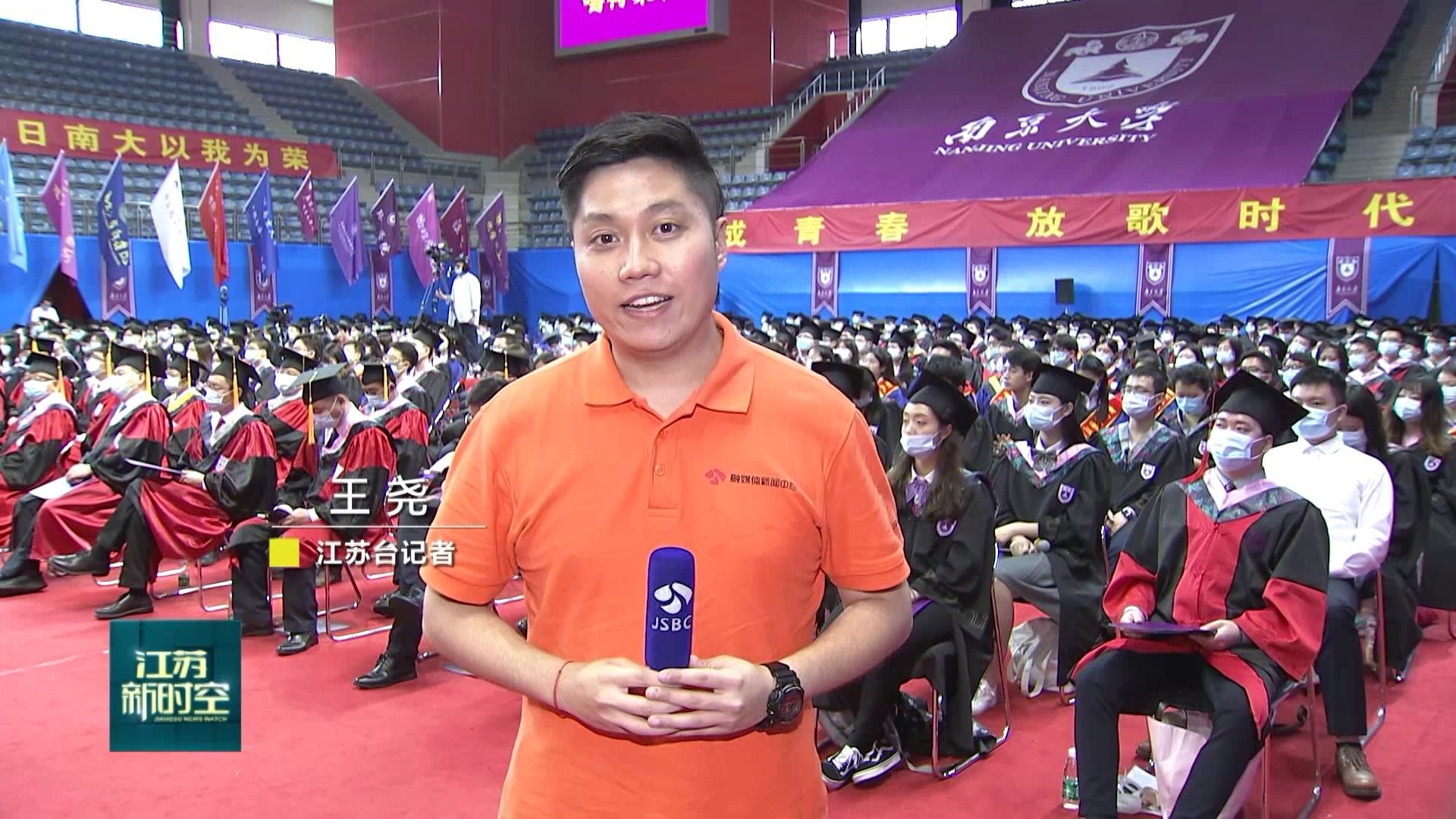 江苏台记者王尧说:“青春因奋斗而美丽,人生因奉献而出彩!在今年这个特殊的毕业季,南京大学毕业生在现场和云上,迎来了属于自己的毕业典礼。”