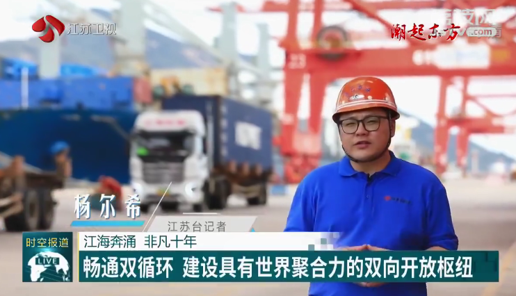 江苏台记者杨尔希报道:“这里是江苏省最大的海港,连云港港。前不久,连云港港三十万吨级航道正式全线贯通,港口功能实现根本性的提升。十年前这里只有一个主港区,海河联运业务也刚刚起步,乘着共建‘一带一路’合作的东风,如今‘一体两翼’组合大港的格局已经全面拉开,10年累计吞吐量完成22.1亿吨。”
