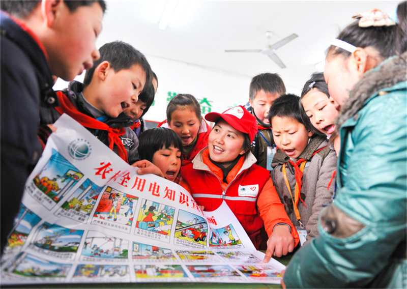 △国家电网江苏电力(金湖飞虎)共产党员服务队队员在学校为小朋友们宣传普及安全用电知识 梁德斌 摄