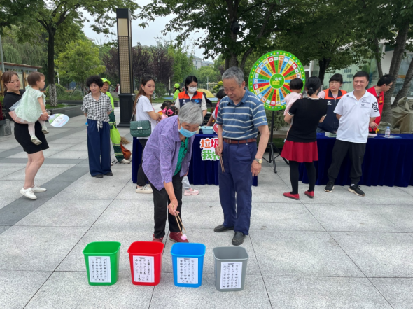 “筷”速出“圾”,互动体验“添动力”。积极响应并参与街道组织的“做好垃圾分类 共建美丽家园”主题宣传活动,组织开展“‘筷’速出‘圾’”垃圾分类体验活动,邀请居民参与到垃圾分类互动游戏中,通过用筷子夹取贴有各类垃圾贴纸的乒乓球并送入四个垃圾箱的方式,参与沉浸式的实物分类体验,让广大居民快速、有效掌握垃圾分类的正确方法。活动现场,以通俗幽默的语言回答群众关于日常生活中经常搞混的各类垃圾分类问题,有效提升了辖区群众对垃圾分类的知晓度和支持度。