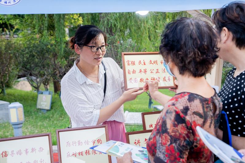 台上宣传文明,台下实践文明,在东关古渡广场,“好地方·夜实践”广陵区新时代文明实践惠民活动志愿服务集市,如盛夏的气温一样火热。听,金牌导游讲解漫游广陵古城;看,扬州剪纸非遗展示;询,中医提供夏季养生咨询;答,律师免费解答法律法规……志愿者热情服务,市民、游客乐享“文明大餐”。