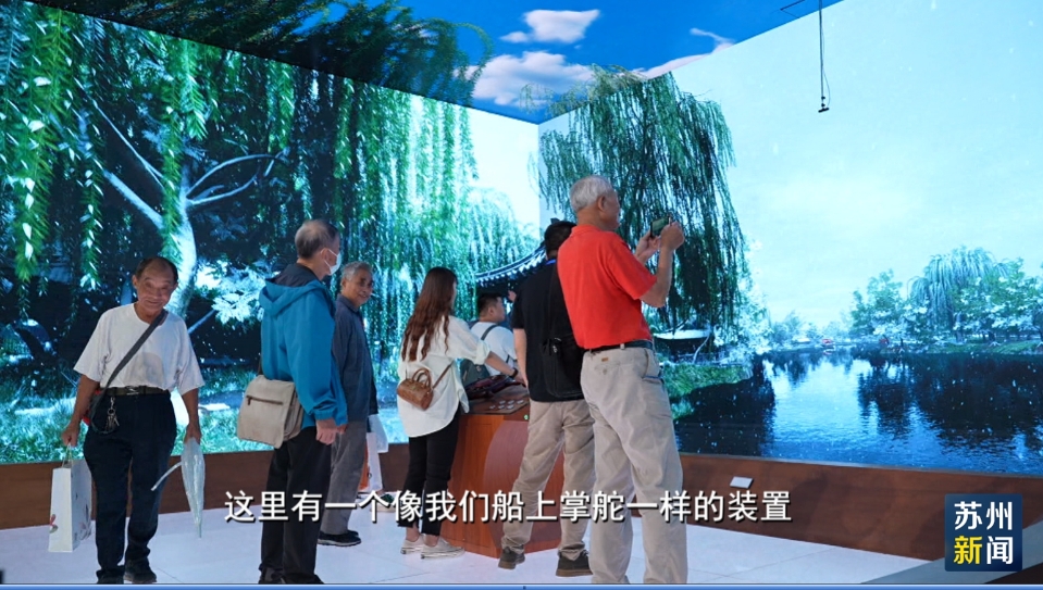 在大运河元宇宙馆里,通过操控互动装置,可以在大运河上进行游览,不仅能控制方向,也能控制前进的速度,脚下也有一些震动,有坐着船在运河上游览的感觉。