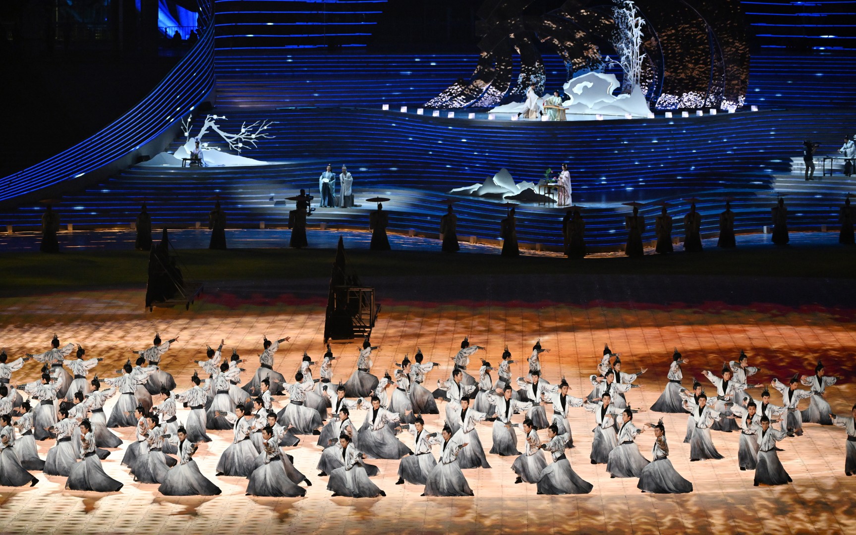 来自公元前3300年良渚古城先民与今天的杭州市民,以亚运会会徽为契机,开启了一场跨越5000年的时空交集,拉开了文艺表演上篇《国风亚韵》的序幕,一场“文化奇旅”由此展开:水墨丹青、烟雨江南、放飞孔明灯与“相知无远近,万里尚为邻”的祈愿……直到各行各业的人们唱出自己的幸福生活——在AR和裸眼3D等技术加持下,属于中国,也属于全亚洲的故事引起了人们的共鸣。