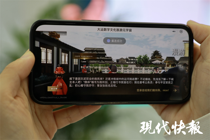 运河文旅产业展内,历史脉络与人文技术串珠连线,3D全息显示等先进技术,带你置身粉墙黛瓦、小桥流水、亭台楼阁的水乡,体验触、听、嗅、视等个性化的文旅体验。运河特色旅游产品展中,元宇宙里的运河古镇等你来畅游。化身“主人公”,大唐书法家颜真卿将带领你“登楼试长望,望极与天平”。