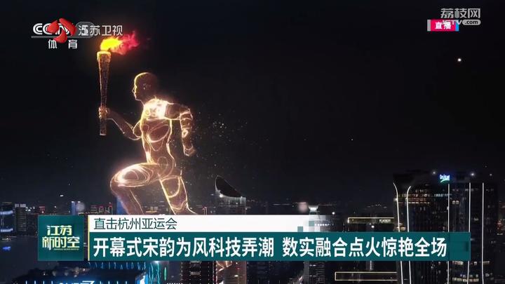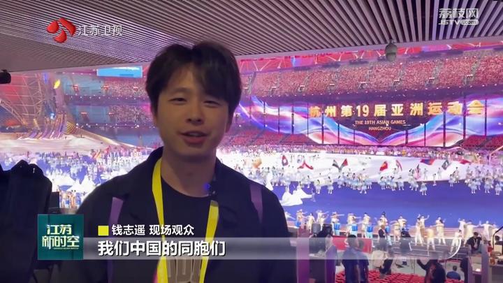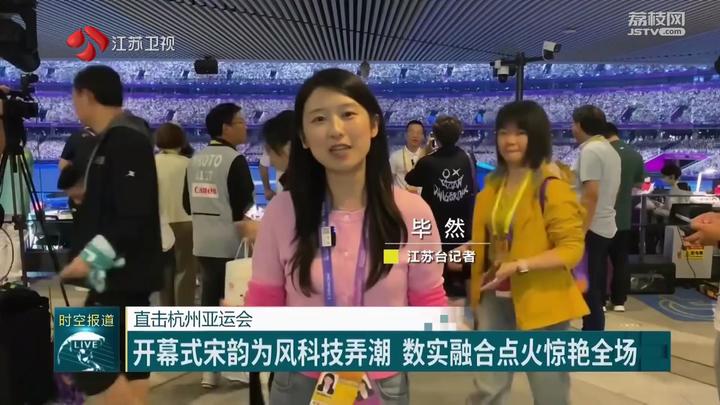 江苏台记者毕然:“这里是杭州奥体中心体育场——‘大莲花’,也是本届亚运会的开幕式现场。随着这场体育盛会的召开,亚洲体育健儿们欢聚一堂,向着‘更快更高更强’的竞技梦想迈进,也让亚洲乃至世界各国的人们相遇、相识,成为了一家人。”