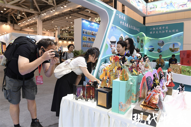在运河城市文旅精品展,特设“大运河元宇宙互动体验展厅”,采用AI数字建模技术,高精度还原大运河沿线部分城市文化遗产点(段)的自然人文景观,通过虚拟现实、数智人交互、AR合影等数字化应用,实现人物入画、内外互动,观众还可以自己掌舵驾船,多重视角欣赏运河壮美风貌。
