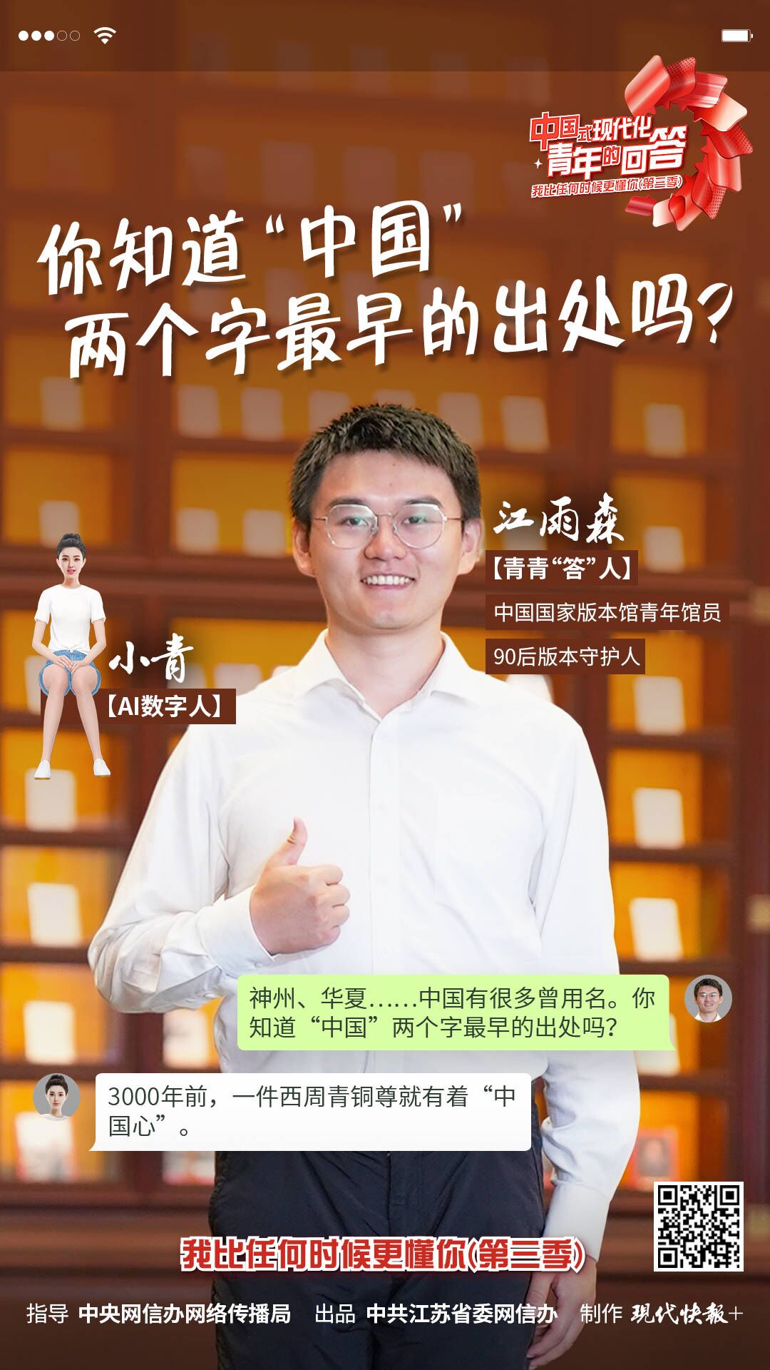 推进中国式现代化这张时代考卷,当代青年应该如何作答?2023年,由中央网信办网络传播局指导,中共江苏省委网信办出品,现代快报+制作推出“中国式现代化·青年的回答——我比任何时候更懂你(第三季)”系列短视频。从炎炎烈日到秋意冉冉,30位青青“答”人携手AI数字人小青,奔赴全国23个城市,以青春之力、以奋斗之姿,回答着青春之问,担负起青春之责,共同书写中国式现代化新答卷。