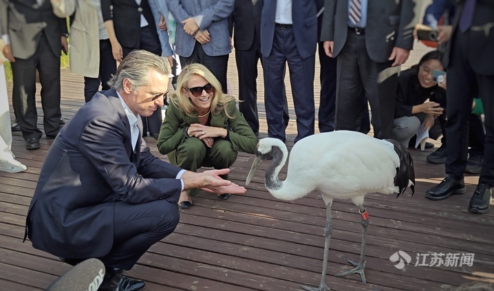 盐城是世界上最大的丹顶鹤越冬地。纽森一行来到丹顶鹤保护区,边走边看,对丹顶鹤在东北地区繁殖、到盐城越冬的过程问得仔细。一只一岁多的丹顶鹤走在人群前,当起了向导,体态优雅、脚步从容,一直将纽森一行送到车门处。临别前,在同行者的提议下,纽森夫妇为这只可爱的丹顶鹤取了个名字——“加利福尼亚”。跨越浩瀚的太平洋,江苏和加州又多了一位友好使者。