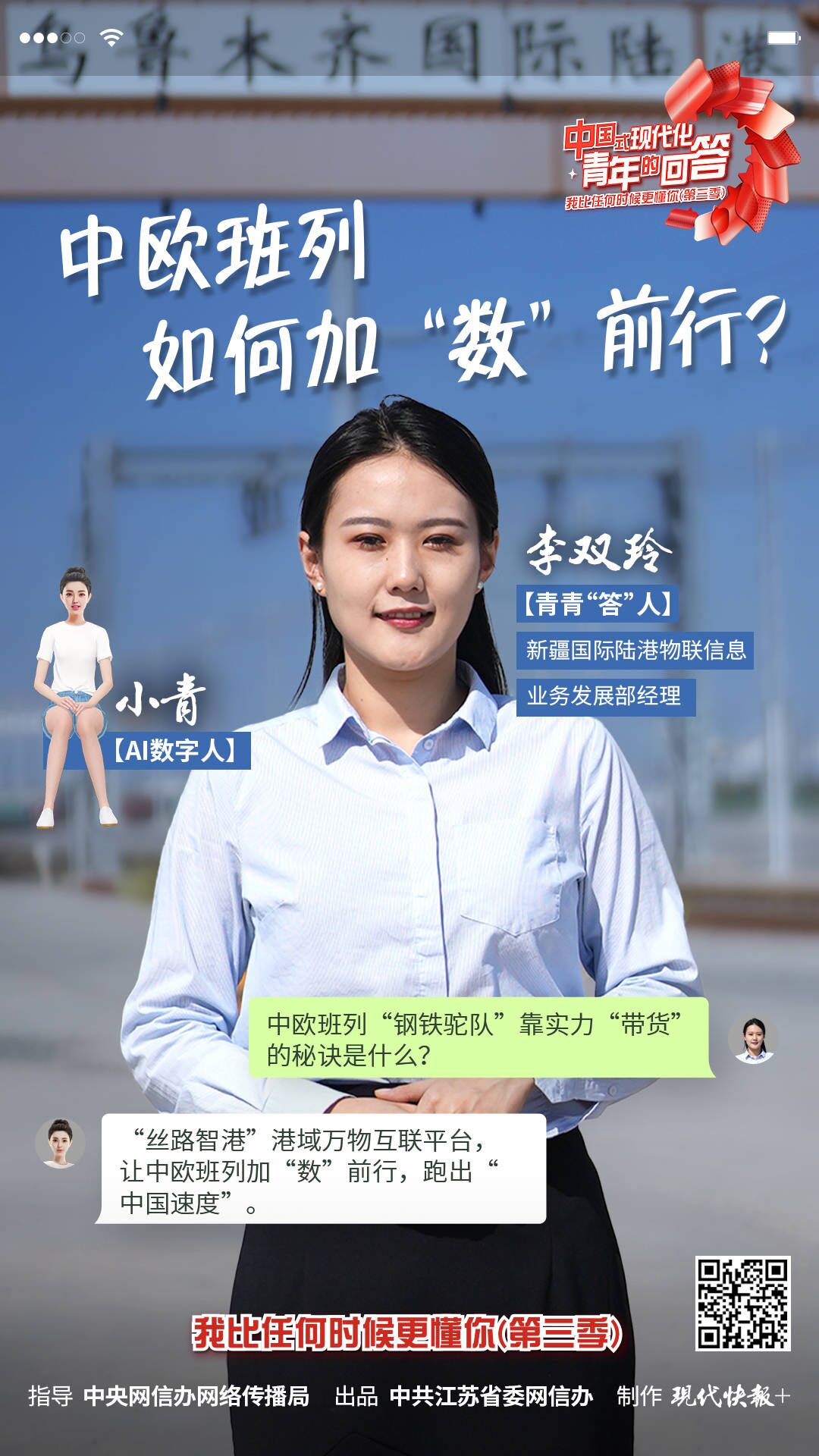 10月31日,“中国式现代化·青年的回答——我比任何时候更懂你(第三季)”系列短视频之《中欧班列如何加“数”前行?》正式上线。本集视频中,青青“答”人——新疆国际陆港物联信息业务发展部经理李双玲和AI数字人小青,带领大家打卡乌鲁木齐国际陆港区,解密中欧班列如何加“数”前行。