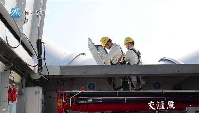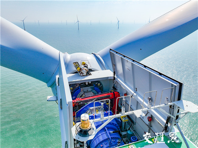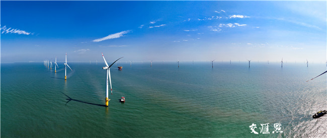 风机转动产生的电,先通过16根海缆送到升压站,进行升压处理后通过两根主海缆直接送到陆上集控中心,再进行并网送电。