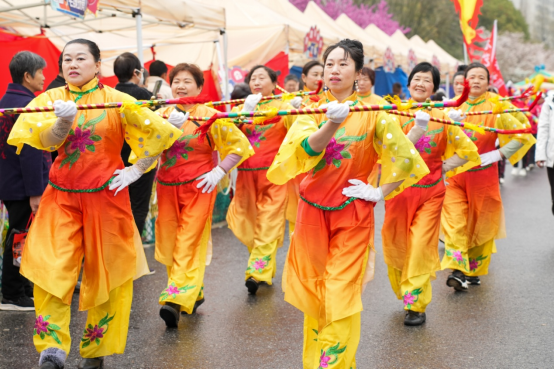 活动当天,干城路上粉色的樱花树海旁,一个个整齐的摊位沿路摆开,冰糖葫芦、海棠糕、肉夹馍、小百货、珍珠首饰等集市摊位琳琅满目,让人目不暇接。净慧寺庙会巡游队伍甫一登场就吸引了全场游客的目光,舞龙舞狮、花篮迎春、渔翁戏蚌、乾隆下江南、锣鼓表演、抖空竹、打莲湘等热闹喜庆的文化演出逐一亮相,把本次净慧寺庙会活动推向高潮。