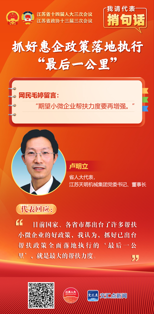 “目前国家、各省市都出台了许多帮扶小微企业的好政策,我认为,抓好已出台帮扶政策全面落地执行的‘最后一公里’,就是最大的帮扶力度。”省人大代表,江苏天明机械集团党委书记、董事长卢明立认为,帮扶中小微企业政策的落实执行需要从多个方面入手,包括优化金融服务、减轻税费负担,降低制度性交易成本、营造公平竞争的市场环境等。