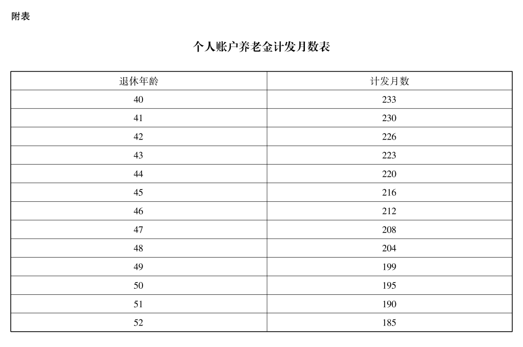 (二)改革基本养老金计发办法。基本养老金由基础养老金和个人账户养老金组成。参保人员达到法定退休年龄且缴费年限(含视同缴费年限,下同)累计满15年的,基础养老金月标准以当地上年度职工月平均工资和本人指数化月平均缴费工资的平均值为基数,缴费每满1年发给l%。个人账户养老金月标准为个人账户储存额除以计发月数(见附表)。计发月数按职工退休时城镇人口平均预期寿命、本人退休年龄、利息等因素确定。缴费年限累计不满15年的,不发给基础养老金,个人账户储存额一次支付给本人,终止基本养老保险关系。
