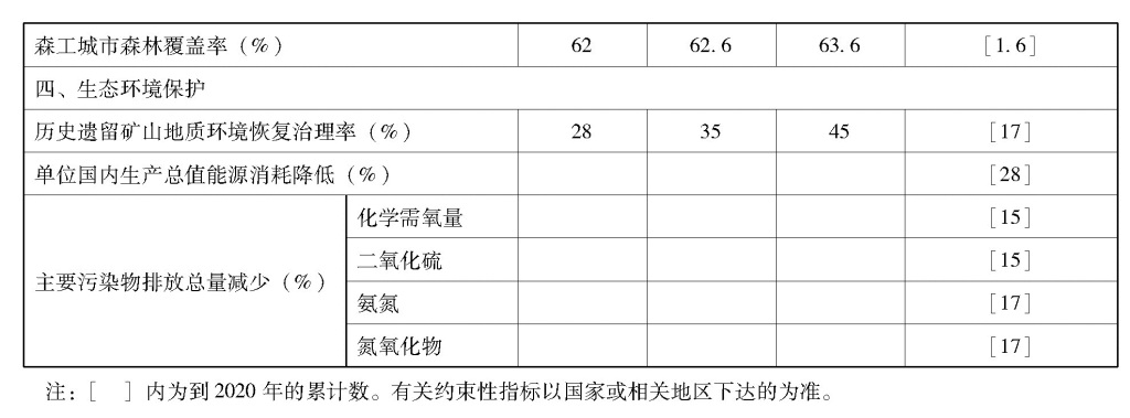 人居环境优美。矿山地质环境得到有效保护,历史遗留矿山地质环境问题的恢复治理率大幅提高,因矿山开采新损毁的土地得以全面复垦利用,新建和生产矿区不欠新账。主要污染物排放总量大幅减少,重金属污染得到有效控制。重点地区生态功能得到显著恢复。城市基础设施进一步完善,综合服务功能不断增强,生态环境质量显著提升,形成一批山水园林城市、生态宜居城市。
