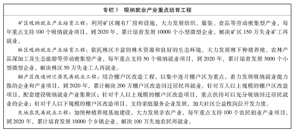 坚持产业结构转型升级与扩大就业良性互动。大力发展带动就业能力强、市场前景好的劳动密集型产业,扶持一批形式多样的小型微型企业,重点解决困难群体就业问题,到2020年,累计吸纳500万失业矿工、林区失业工人、棚户区改造回迁居民及失地农民再就业。支持农牧资源丰富城市发展农牧产品深加工,鼓励森工城市依托特色林下资源发展食用菌、山野菜等绿色食品加工业。引导劳动力和原材料成本优势明显的城市发展纺织、服装、玩具、家电等消费品工业。加大技术改造投入,提高劳动密集型产品附加值。落实金融、税收等优惠政策,完善服务体系,营造促进小型微型企业健康发展的政策环境。