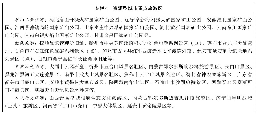 结合资源型城市产业基础和发展导向,积极发展类型丰富、特色鲜明的现代服务业。依托资源产品优势,建设一批煤炭、铁矿石、原油、木材等资源产品和钢铁、建材、化工等重要工业产品区域性物流中心。大力发展资源产业托管服务、工程和管理咨询。在有效保护资源基础上,鼓励生态环境优良的森工城市发展休闲度假旅游,支持自然山水资源丰富的城市发展自然风光旅游,推进工业历史悠久的城市发展特色工业旅游,扶持革命遗址集中的城市发展红色旅游。引导社区商业和家庭服务业发展,完善棚户区改造回迁居民区服务网点建设。支持有条件的城市积极发展金融服务、服务外包、文化创意、人力资源、会展等现代服务业。