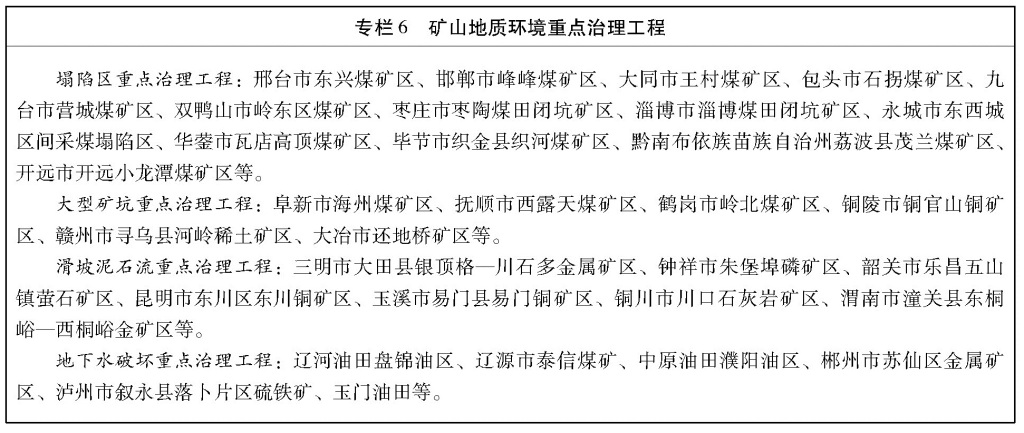 按照“谁破坏,谁治理”的原则,将企业的生态环境恢复治理成本内部化。深入开展采矿沉陷区、露天矿坑等重大矿山地质环境问题治理,对属于历史遗留或责任人已经灭失的地质结构复杂、危害严重、治理难度大的深部采空区等突出地质环境问题治理给予重点支持。切实做好尾矿库闭库后期管理工作,加大对石油、地下水、卤水等液体矿产资源开采造成的水位沉降漏斗、土地盐碱化等问题的治理力度。防范地下勘探、采矿活动破坏地下水系,选择部分地下水体破坏严重城市率先开展地下水修复试点。大力推进废弃土地复垦和生态恢复,支持开展历史遗留工矿废弃地复垦利用试点,积极引导社会力量参与矿山环境治理。新建矿区要科学规划、合理布局,加强对矿产资源开发规划和建设项目的环境影响评价工作,切实预防环境污染和生态破坏。加强对资源开采活动的环境监理,严格执行“三同时”制度,强化同步恢复治理。