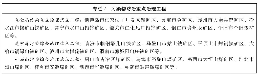 严格执行重点行业环境准入和排放标准,把主要污染物排放总量控制指标作为新建和改扩建项目审批的前置条件。强化火电、冶金、化工、建材等高耗能、高污染企业脱硫脱硝除尘,加强挥发性有机污染物、有毒废气控制和废水深度治理。到2015年,城市水功能区主要水质达标率不低于所在省份平均指标。防范地下勘探、采矿活动污染地下水体,取缔水源保护区内违法建设项目和排污口,加快现有污水处理厂升级改造。到2020年,实现工业废水排放完全达标。加强煤矸石、粉煤灰、冶炼和化工废渣等大宗工业固体废物的污染防治和综合治理,矿区和产业集聚区实行污染物统一收集和处置,规范危险废物管理,加快城镇生活垃圾处理设施建设。到2020年,工业固体废弃物(不包括尾矿)综合利用率达到85%以上。积极开展重金属污染综合治理,以采矿、冶炼、化学原料及其制品等行业为重点,严格控制汞、铬、镉、铅和类金属砷等重金属排放总量。加大资金技术投入,选择部分问题突出城市开展矸石山、尾矿库综合治理和重金属污染防治试点工程。