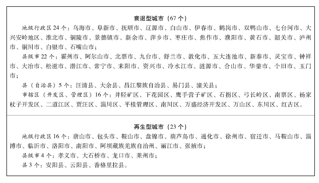 衰退型城市资源趋于枯竭,经济发展滞后,民生问题突出,生态环境压力大,是加快转变经济发展方式的重点难点地区。应着力破除城市内部二元结构,化解历史遗留问题,千方百计促进失业矿工再就业,积极推进棚户区改造,加快废弃矿坑、沉陷区等地质灾害隐患综合治理。加大政策支持力度,大力扶持接续替代产业发展,逐步增强可持续发展能力。