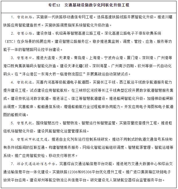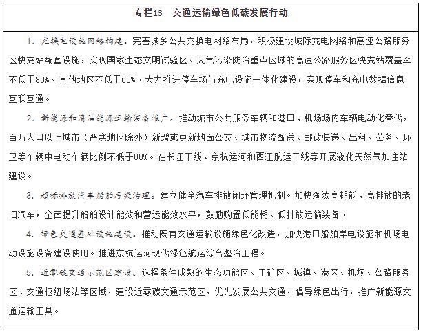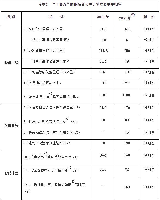 注:①〔〕内为5年累计数。②指纳入国家批准的城市轨道交通建设规划中的大中运量城市轨道交通项目。③指国际枢纽机场和区域枢纽机场中连通轨道交通的机场数量占比。④指重点营运车辆、邮政快递自有干线运输车辆、应安装具备卫星定位功能船载设备的客船及危险品船等。⑤指新能源公交车辆占所有地面公交车辆的比重。⑥指按单位运输周转量计算的二氧化碳排放。
