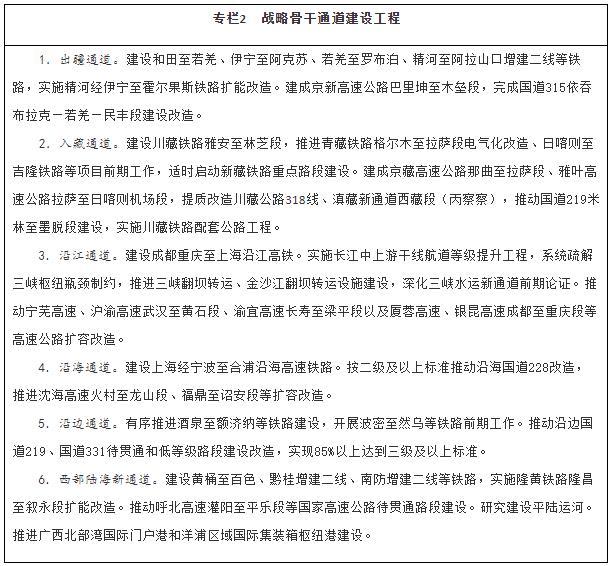 加强战略骨干通道建设。推进出疆入藏通道建设,扩大甘新、青新、青藏、川藏四条内联主通道通行能力,稳步推进川藏铁路建设,加快推进新藏铁路和田至日喀则段前期工作、适时启动重点路段建设,有序推进滇藏铁路前期工作,密实优化航空航线网络布局,构建多向联通的通道布局。畅通沿江通道,加快建设沿江高铁,优化以高等级航道和干线铁路、高速公路为骨干的沿江综合运输大通道功能。升级沿海通道,提高铁路通道能力,推进高速公路繁忙路段扩容改造,提升港口航道整体效能,构建大容量、高品质的运输走廊。贯通沿边通道,提级改造普通国省干线,推进重点方向沿边铁路建设,提高安全保障水平。建设西部陆海新通道,发挥铁路在陆路运输中的骨干作用和港口在海上运输中的门户作用,强化东、中、西三条通路,形成大能力主通道,衔接国际运输通道。