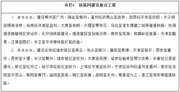 建设现代化铁路网。坚持客货并重、新建改建并举、高速普速协调发展,加快普速铁路建设和既有铁路扩能改造,着力消除干线瓶颈,推进既有铁路运能紧张路段能力补强,加快提高中西部地区铁路网覆盖水平。加强资源富集区、人口相对密集脱贫地区的开发性铁路和支线铁路建设。推进高速铁路主通道建设,提升沿江、沿海、呼南、京昆等重要通道以及京沪高铁辅助通道运输能力,有序建设区域连接线。综合运用新技术手段,改革创新经营管理模式,提高铁路网整体运营效率。统筹考虑运输需求和效益,合理规划建设铁路项目,严控高速铁路平行线路建设。