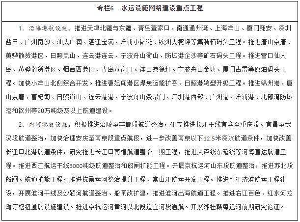 优化畅通水运设施网络。建设京津冀、长三角、粤港澳大湾区世界级港口群,支持山东打造世界一流的海洋港口,推进东北地区沿海港口一体化发展,优化港口功能布局,推动资源整合和共享共用。有序推进沿海港口专业化码头及进出港航道等公共设施建设。适度超前建设粮食、能源、矿产资源的接卸、储存、中转设施,推进沿海沿江液化天然气码头规划建设。提升内河港口专业化、规模化水平,合理集中布局集装箱、煤炭、铁矿石、商品汽车等专业化码头。加强内河高等级航道扩能升级与畅通攻坚建设,完善长江、珠江、京杭运河和淮河等水系内河高等级航道网络,进一步提升珠三角高等级航道网出海能力,全面加强长三角、珠江—西江高等级航道网未达标段建设。推动重要支流航道和库湖区航道、内河旅游航道、便民码头建设。